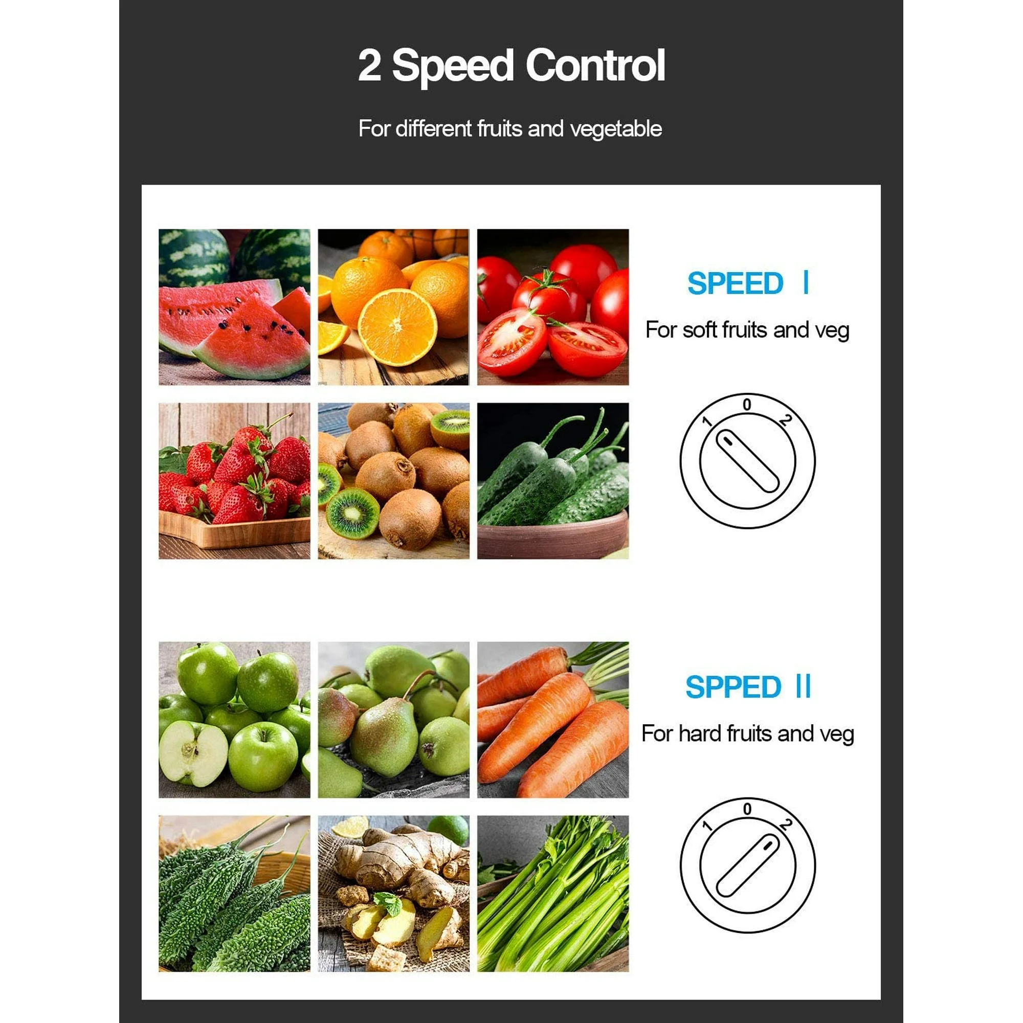 • Dual Speeds: Offers two-speed control (12000-18000 RPM) for versatile juicing, with “1” for soft fruits and “2” for hard fruits and vegetables.